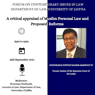Honorable Justice Saleem Marsoof P.C. and Former Justice of the Supreme Court of Sri Lanka was invited to facilitate a virtual ‘Forum on Contemporary Issues in Law’ on the topic of ‘A critical appraisal of Muslim Personal Law and Proposed Reforms’, on 18th September 2021 from 3:00 pm to 5:00 pm. It was coordinated and moderated by Mr. Sivanesan Pradinath, Lecturer, Department of Law, UoJ. The FCIL was attended by more than 120 undergraduates of the Department of Law.